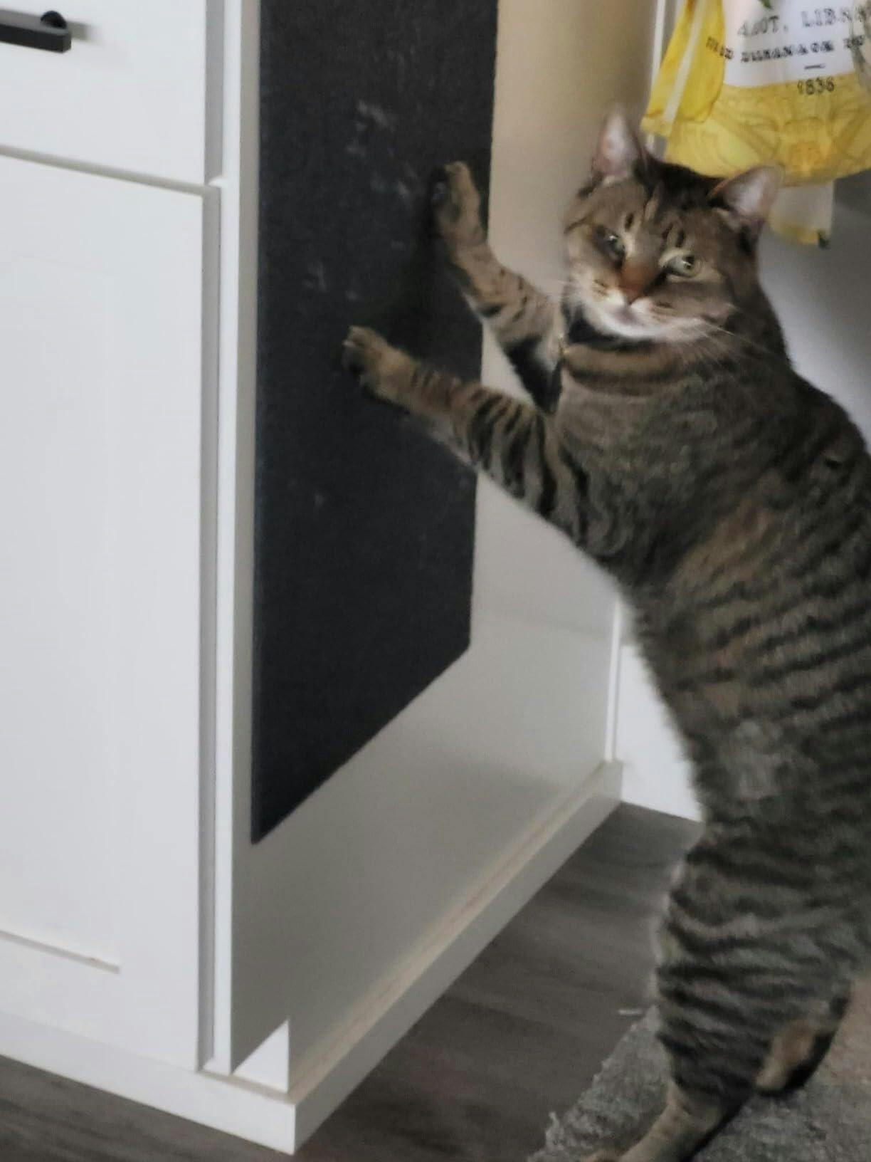 The trickiest part of this is peeling the clear plastic sheet off the sticky silver side of the 21ME Cat Scratch mat. Once started it is easy. The material feels tough and is standing up to the kittens well, those kittens being 8 to 12 pounds at this point so are quite strong. I really like that the adhesive sticks strong and the kittens haven't managed to pull it loose yet as I've only put it on regular framing lumber. It stays stuck even though I bent it around the corners. The protective sheet has a grid marking that makes it a lot easier to cut straight and correct dimensions you may need. I used a regular kitchen shears to make the cuts and had no issue cutting or with adhesive getting onto the scissors.
